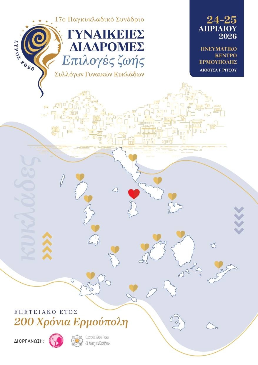 Η Ομοσπονδία Συλλόγων Γυναικών Κυκλάδων (ΟΣΥΓΥ) – Οι Κόρες Των Κυκλάδων σε συνεργασία με τον Σύλλογο Γυναικών Σύρου διοργανώνουν το 17ο Παγκυκλαδικό Συνέδριο Συλλόγων Γυναικών Κυκλάδων (Σύρος, 24-25 Απριλίου 2026) ανοίγοντας έναν εποικοδομητικό διάλογο για όλες τις γυναίκες. Το φετινό συνέδριο με θέμα «Γυναικείες διαδρομές – Επιλογές ζωής: υγεία, επάγγελμα, οικογένεια, σεξουαλικότητα, ελεύθερος χρόνος» δίνει βήμα “στις γυναίκες που κουβαλούν μνήμες, εμπειρία και ιστορίες ζωής, στις νέες που αναζητούν τον δρόμο τους, στις εργαζόμενες και τις μητέρες και σε κάθε γυναίκα που έχει ανάγκη να ακουστεί”. Μέσα από εισηγήσεις, παρεμβάσεις και ανοιχτές συζητήσεις, οι γυναίκες των Κυκλάδων θα μιλήσουν για όσα τις απασχολούν σήμερα, αναζητώντας παράλληλα απαντήσεις και προοπτικές για το αύριο.