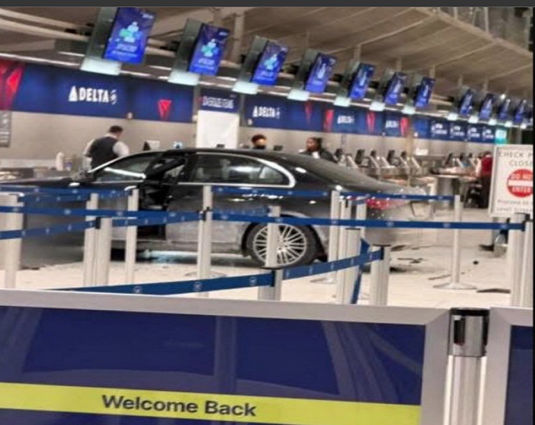 Βίντεο που δημοσιεύτηκε στα μέσα κοινωνικής δικτύωσης δείχνει μπλε, τετράθυρο σεντάν σταματημένο, με το καπό του και το φορτηγό ανοιχτό, μπροστά από τα γκισέ της Delta Air Lines.