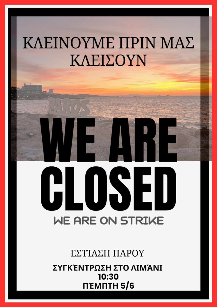 Με τον ηχηρό τίτλο «Κλείνουμε πριν μας κλείσουν», οι επιχειρηματίες εστίασης της Πάρου προχωρούν σε απεργιακή κινητοποίηση την Πέμπτη 5 Ιουνίου μην αντέχοντας άλλο τον εμπαιγμό, σε μια σεζόν που αντί για ξεκίνημα φέρνει… λουκέτα. Αιτία το ασφυκτικό φορολογικό πλαίσιο, τα άδικα βαριά πρόστιμα και η κρατική αναλγησία.