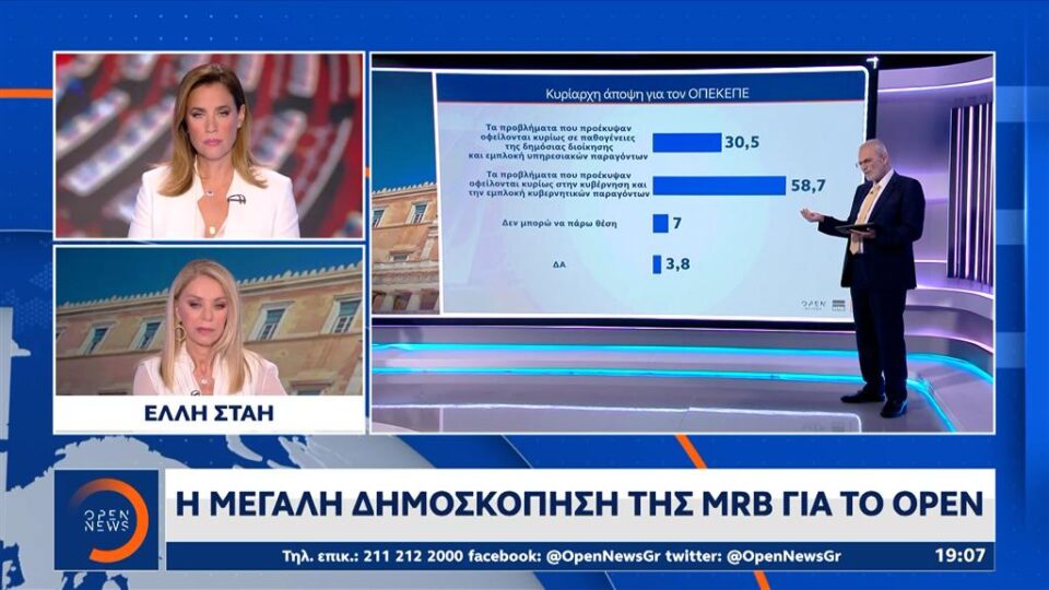 Προβάδισμα 14,4 ποσοστιαίων μονάδων στην πρόθεση ψήφου με αναγωγή έχει η Νέα Δημοκρατία έναντι του ΠΑΣΟΚ, στην πανελλαδική δημοσκόπηση της MRB για το κεντρικό δελτίο ειδήσεων του OPEN.