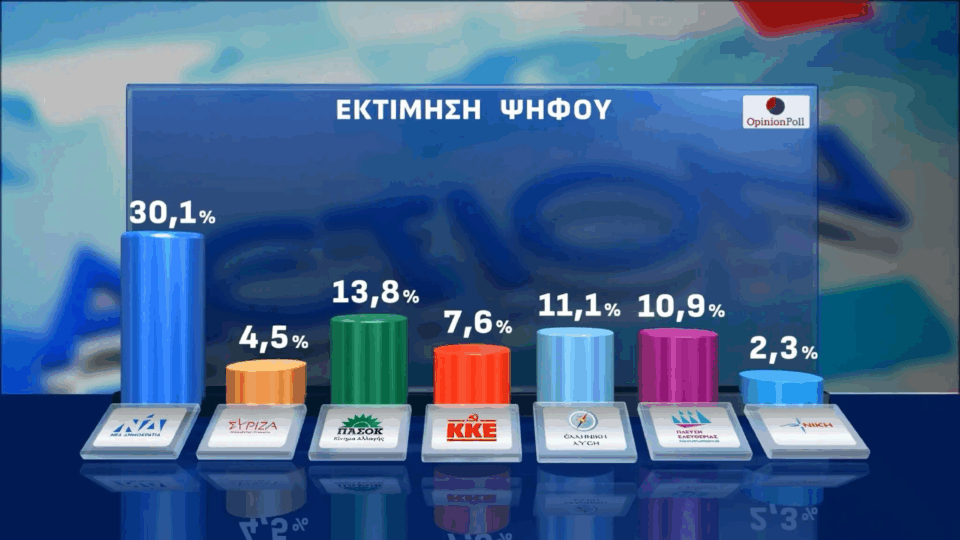 Συγκεκριμένα σύμφωνα με την δημοσκόπηση της Opinion Poll η ΝΔ έχει προβάδισμα 16,3 μονάδων από το ΠΑΣΟΚ ενώ στη Βουλή θα έμπαιναν 8 κόμματα αν αύριο είχαμε εκλογές. Την ίδια ώρα ένα 26,1% λέει πως θα ψήφιζε ένα νέο κόμμα Τσίπρα.
