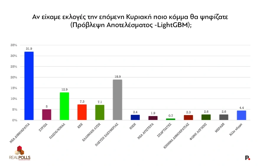 Δημοσκόπηση Real Polls: Αγγίζει το 32% η ΝΔ, στη 2η θέση η Πλεύση, 3ο το ΠΑΣΟΚ, 6 κόμματα στην επόμενη Βουλή