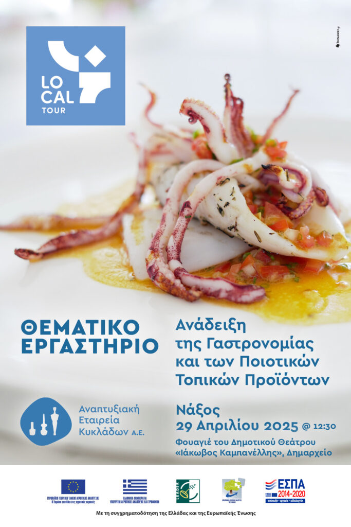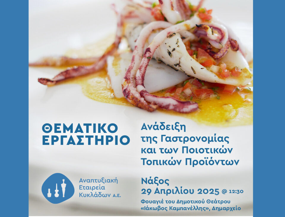 Η Αναπτυξιακή Εταιρεία Κυκλάδων Α.Ε. καλεί τους ενδιαφερόμενους να συμμετάσχουν στο Θεματικό Εργαστήριο με θέμα την «Ανάδειξη της Γαστρονομίας και των Ποιοτικών Τοπικών Προϊόντων», το οποίο θα πραγματοποιηθεί στη Νάξο στις 29 Απριλίου 2025.