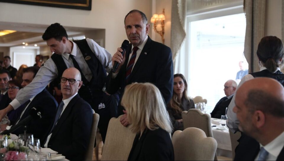 Από ελληνικής πλευράς παρίστανται ο υπουργός Εξωτερικών Γιώργος Γεραπετρίτης, ο Νίκος Δένδιας, ο Κυριάκος Πιερρακάκης, ο Τάκης Θεοδωρικάκος, η Ντόρα Μπακογιάννη, ο Γιώργος Φωτήλας, καθώς και η κα Παπαδοπούλου.