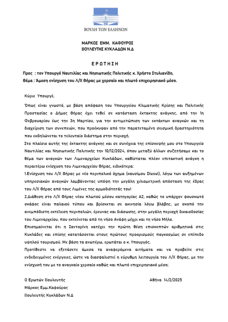 Ο βουλευτής Κυκλάδων της Νέας Δημοκρατίας Μάρκος Καφούρος, κατέθεσε ερώτηση προς τον Υπουργό Ναυτιλίας και Νησιωτικής Πολιτικής κ. Χρήστο Στυλιανίδη με την οποία επισημαίνει την ανάγκη ενίσχυσης του Λιμεναρχείου Θήρας με πλωτά και χερσαία μέσα, λόγω της κατάστασης έκτακτης ανάγκης που έχει τεθεί ο Δήμος Θήρας.