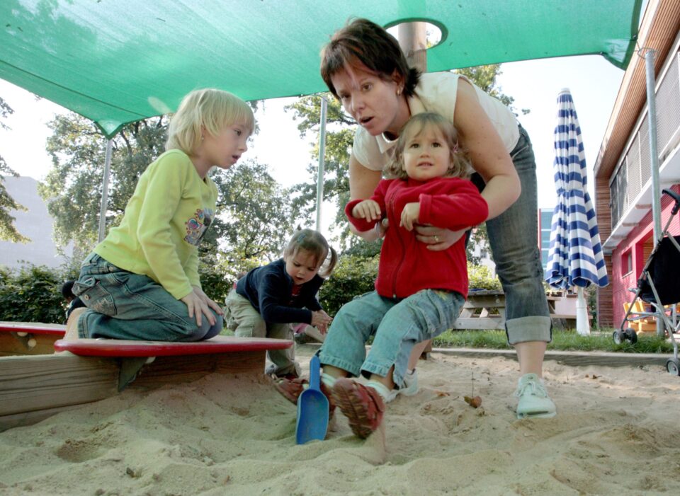 Παιδάκια κάνουν βόλτες με τα αυτοκινητάκια τους σε έναν παιδικό σταθμό, στη Γερμανία.AP Photo/Michael Probst)