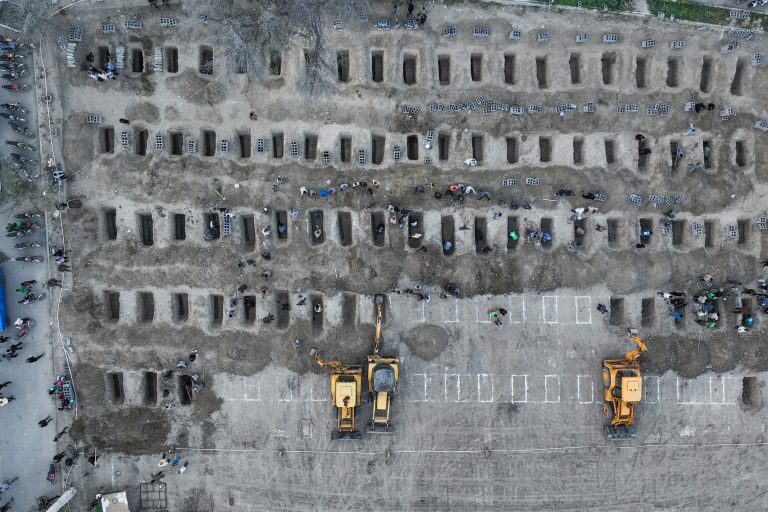 Οι τάφοι, φρεσκοσκαμμένοι, εκτείνονται σε τακτικές σειρές των 20. Πάνω από 60 έχουν ήδη σκαφτεί, με μικρές ομάδες ανθρώπων να στέκονται συγκεντρωμένες γύρω τους. Σε πρώτο πλάνο, δεκάδες ακόμη τάφοι φαίνεται να έχουν σημαδευτεί στο έδαφος: μικρά ορθογώνια με κιμωλία, με εκσκαφείς έτοιμους να ολοκληρώσουν το έργο τους.