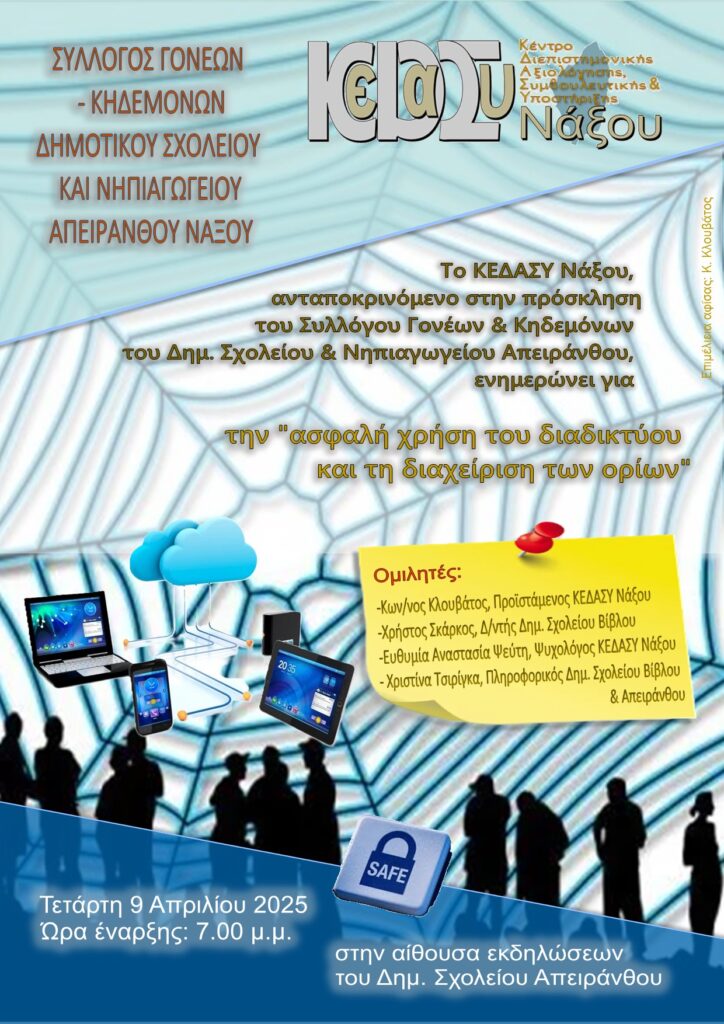 Το ΚΕΔΑΣΥ Νάξου, ανταποκρινόμενο στην πρόσκληση του Συλλόγου Γονέων & Κηδεμόνων του Δημ. Σχολείου & Νηπιαγωγείου Απειράνθου, θα πραγματοποιήσει ενημερωτική εκδήλωση για την ασφαλή χρήση του Διαδικτύου και τη διαχείριση των ορίων χρήσης του. Η εκδήλωση θα λάβει χώρα στην αίθουσα εκδηλώσεων του Δημοτικού Σχολείου Απειράνθου την Τετάρτη 9 Απριλίου 2025 στις 7.00 μ.μ.