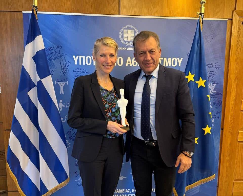 Ο Γιάννης Βρούτσης υποδέχθηκε στο Υπουργείο Αθλητισμού τη Γαλλίδα ομόλογό του, Marie Barsacq, που συνοδευόταν από την Πρέσβειρα της Γαλλίας στην Ελλάδα, Laurence Auer και τον Γερουσιαστή Didier Marie και τη συνεχάρη για την πρόσφατη ανάληψη των καθηκόντων της.