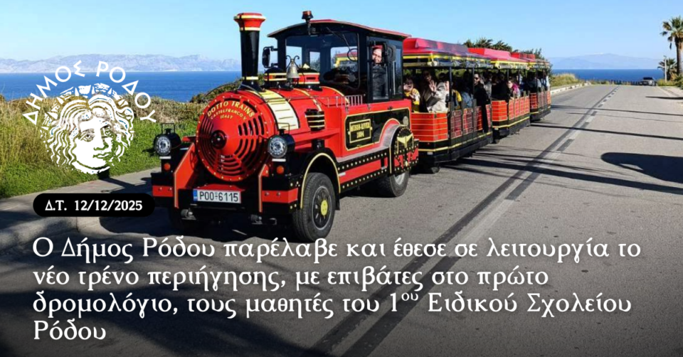 Το νέο τρένο περιήγησης του Δήμου Ρόδου πραγματοποίησε σήμερα το πρώτο του δρομολόγιο ,φιλοξενώντας τους μαθητές του 1ου Ειδικού Σχολείου Ρόδου. Τα παιδία, συνοδευόμενα από τους εκπαιδευτικούς τους, απόλαυσαν μια δωρεάν, 45λεπτη διαδρομή στα σημαντικότερα σημεία της πόλης.