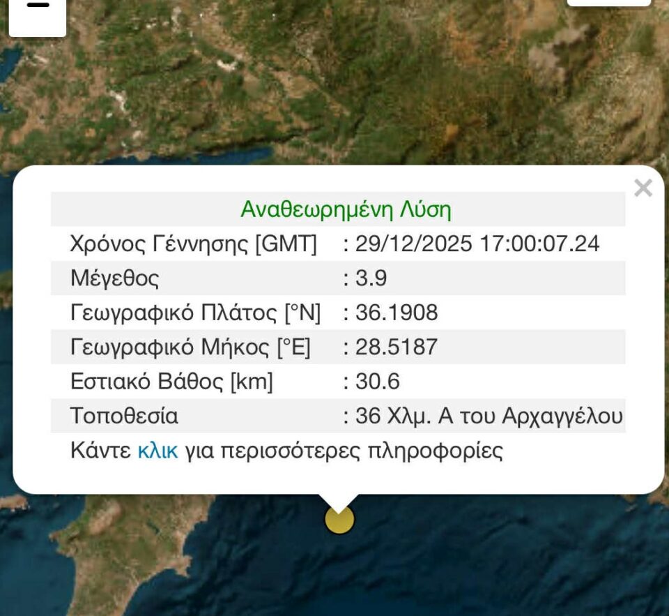Σεισμική δόνηση, εντάσεως 3,9 Ρίχτερ, σημειώθηκε στη Ρόδο. Το επίκεντρο του σεισμού ήταν 36 χιλιόμετρα ανατολικά του Αρχαγγέλου, ενώ το εστιακό βάθος υπολογίζεται στα 30,6 χιλιόμετρα.