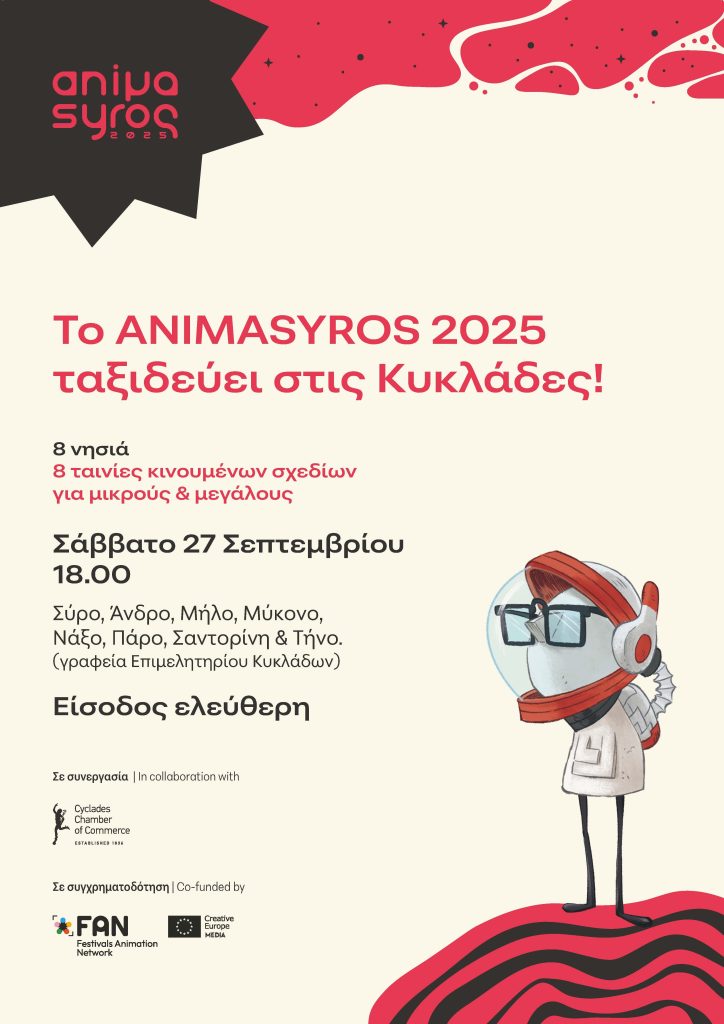 To ANIMASYROS 2025 επιστρέφει για 18η χρονιά, από τις 22 έως τις 28 Σεπτεμβρίου, στην Ερμούπολη και για δεύτερη χρονιά φέτος, ανοίγει τα φτερά του και ταξιδεύει σε ακόμη εφτά νησιά των Κυκλάδων. Σε συνδιοργάνωση με το Επιμελητήριο Κυκλάδων, το μεγαλύτερο φεστιβάλ animation στην Ελλάδα φέρνει μοναδικές προβολές στην Άνδρο, τη Μήλο, τη Μύκονο, τη Νάξο, την Πάρο, τη Σαντορίνη και την Τήνο και προσκαλεί θεατές κάθε ηλικίας σε μια εμπειρία γεμάτη χρώματα και φαντασία.
