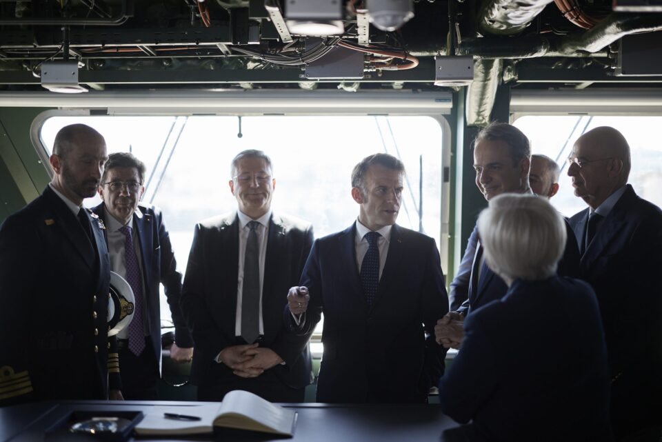Ο Γάλλος πρόεδρος, μαζί με τον πρωθυπουργό Κυριάκο Μητσοτάκη, επιβιβάστηκαν στην πρώτη γαλλικής κατασκευής Belharra που έχει ενταχθεί στον ελληνικό στόλο. Στο υπερσύγχρονο πολεμικό πλοίο, ενημερώθηκαν αναλυτικά για τις επιχειρησιακές του δυνατότητες από την ηγεσία του Πολεμικού Ναυτικού.